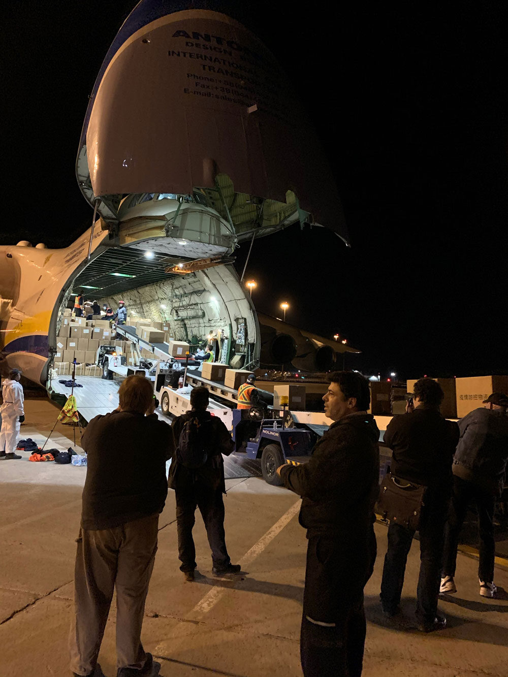 Contracted in partnership with Nolinor Aviation, Momentum Solutions brought the world’s largest cargo aircraft to Montreal’s Mirabel airport, arriving Friday evening with desperately needed personal protective equipment for Quebec’s front line workers.  The aircraft landed at approximately 8:30 pm local time.  A large scale ground handling team stood at the ready, with nearly a dozen trucks lined up to accept the boxes as they were offloaded.  The Nolinor Aviation and Operations Teams worked through the night, and the final box was offloaded at 5:12 am Saturday morning, and the aircraft departed for its next mission at approximately 7:00 am.